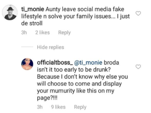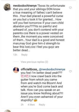 After all these, TBoss fought dirty with her followers on Instagram, with one of the comments that claimed her father is a Humble man. See some screenshots below;